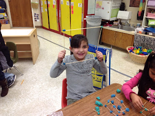 The calendar helper reads yesterday was Monday today is Tuesday tomorrow will be Wednesday. Make them read complete sentences! She adds one number to the calendar daily. The number cards have pictures on them to let students predict number and picture based on pattern. Then her students label the pattern type using abc abac etc...suggests building the pattern on a long sentence strip & adding to it each day. Students sitting on the rug with white boards write pattern on board. Reyes says boards up and they show them. Informal assessment!!! Boards down let's see which row can be ready first. Erased and leader picks quickest row. Make pattern then transfer. Pipe cleaner threaded through unifix cubes---hanging on wall. Add a new cube each day.